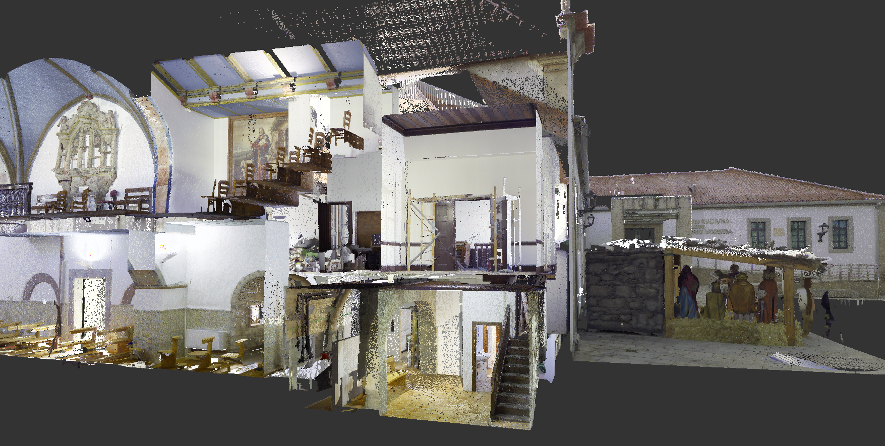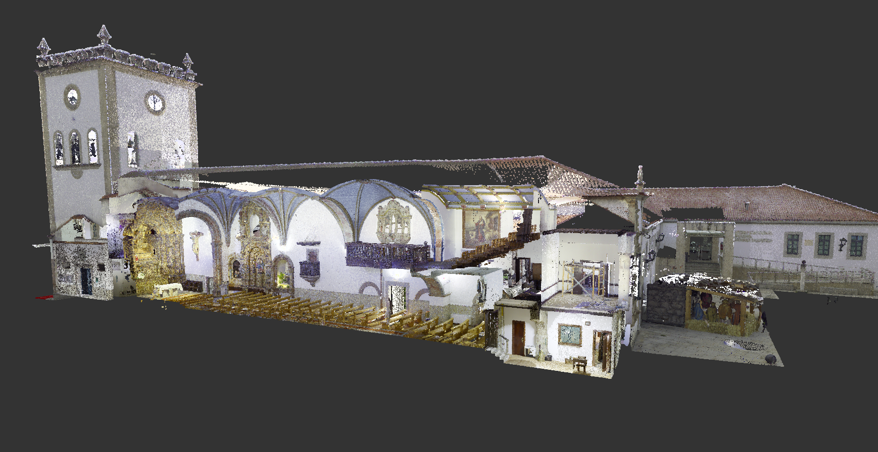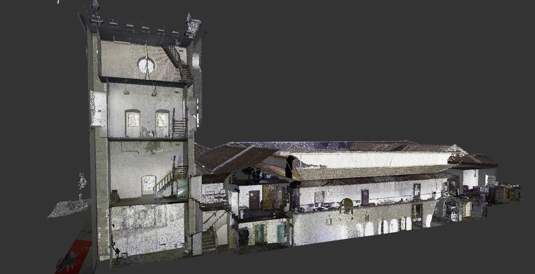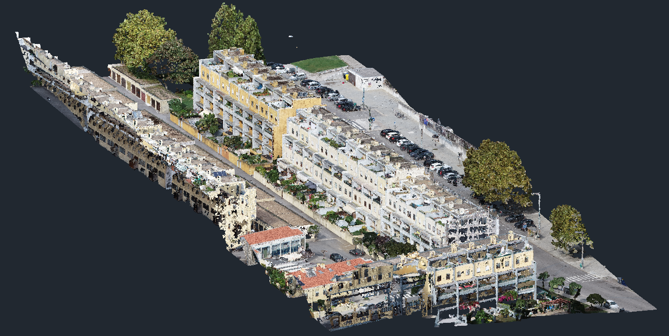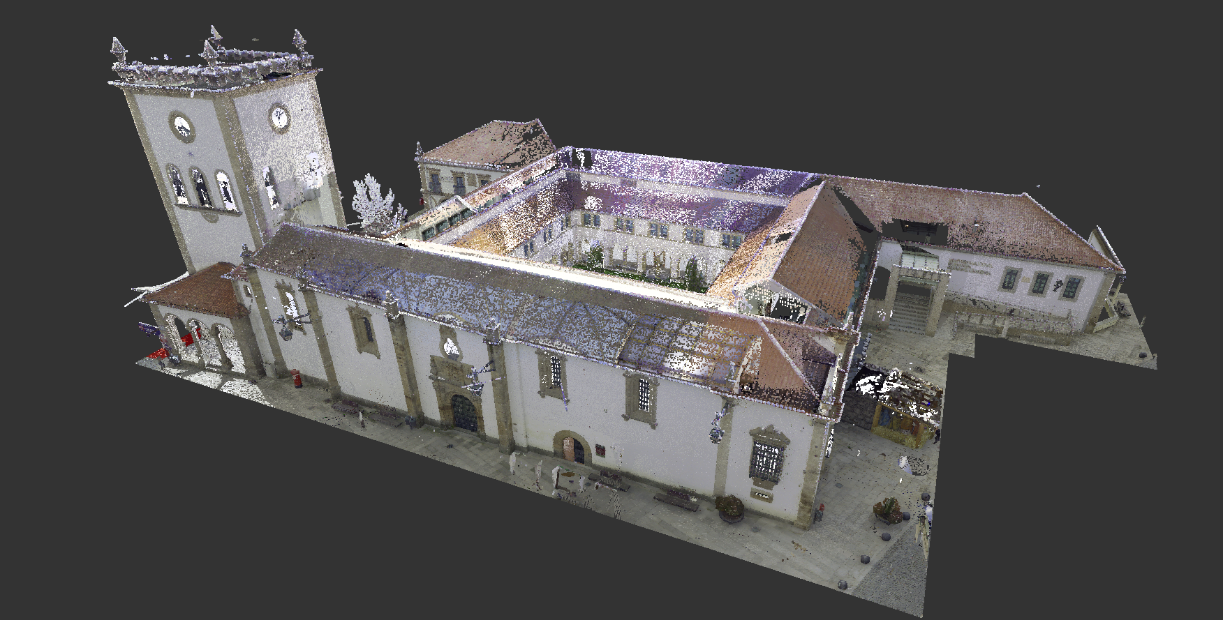 Levantamento arquitetónico, combinando técnicas de aerofotogrametria, laser scanning e topografia clássica, com o objetivo de produzir desenhos técnicos, incluindo planta de cobertura e alçados à escala 1:100.